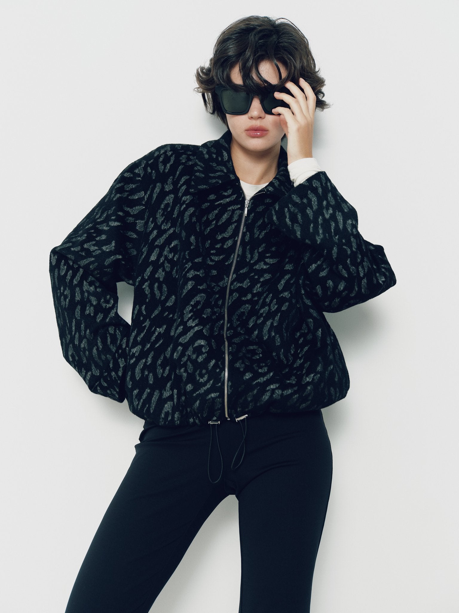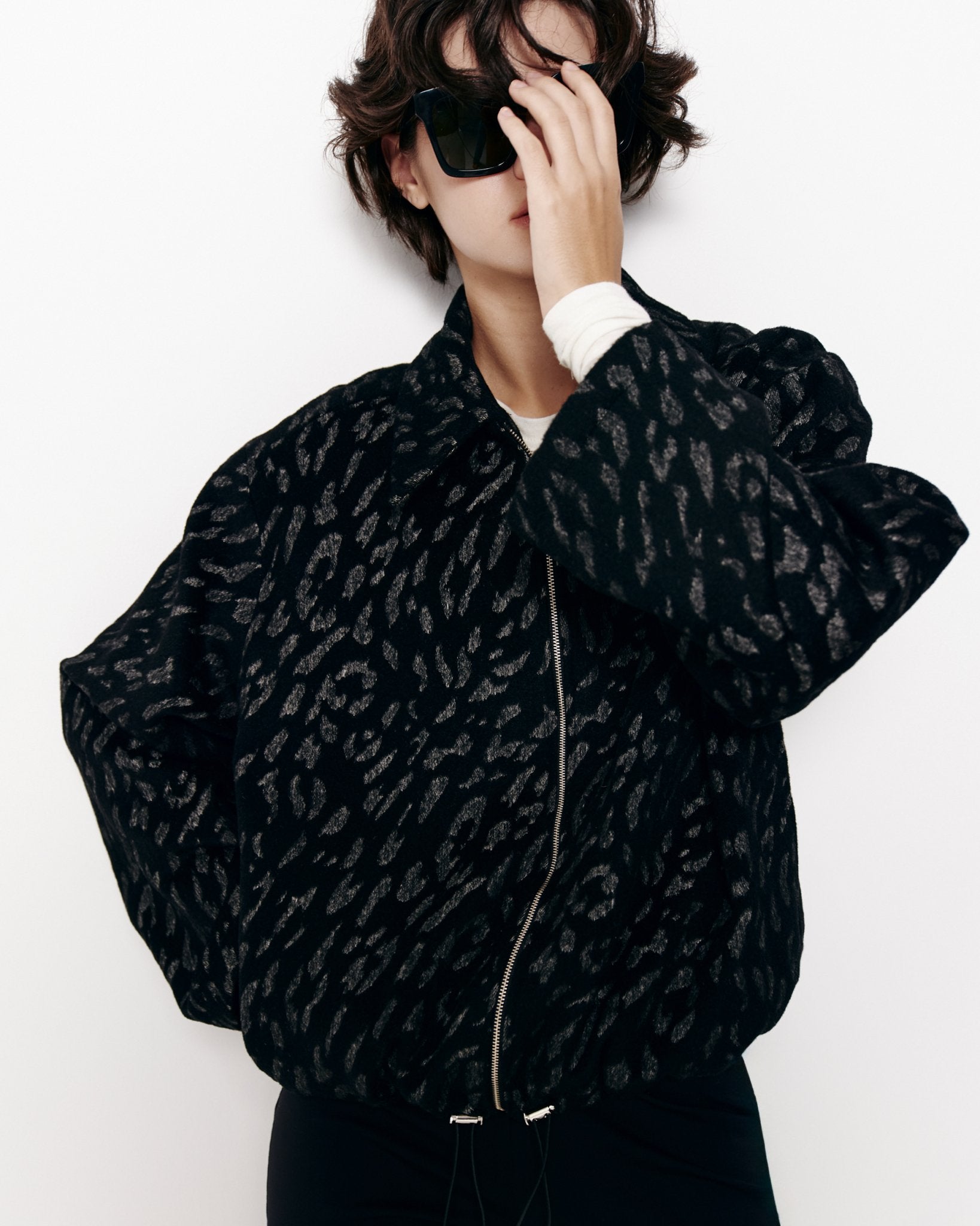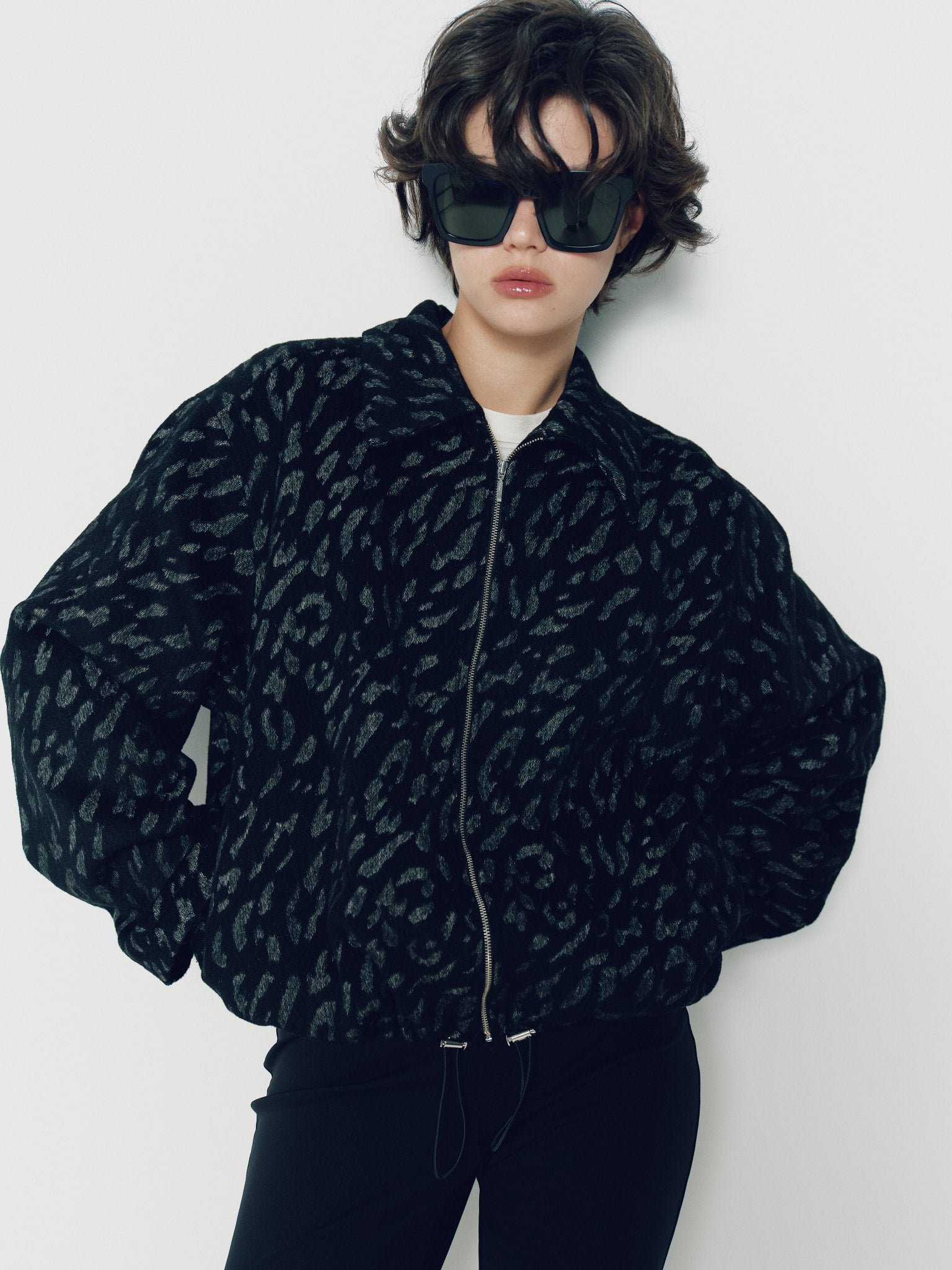Оверсайз Бомбер з принтованоі шерсті темно-сірого кольору , з боковими кишенями на підкладці застібується на блискавку ykk