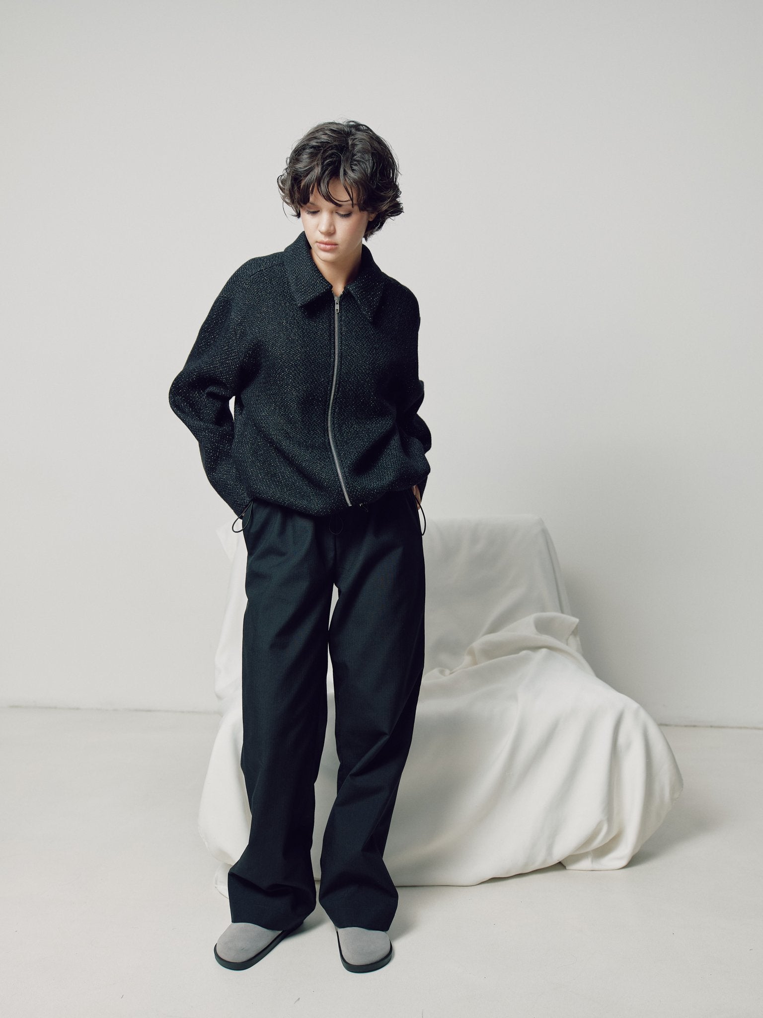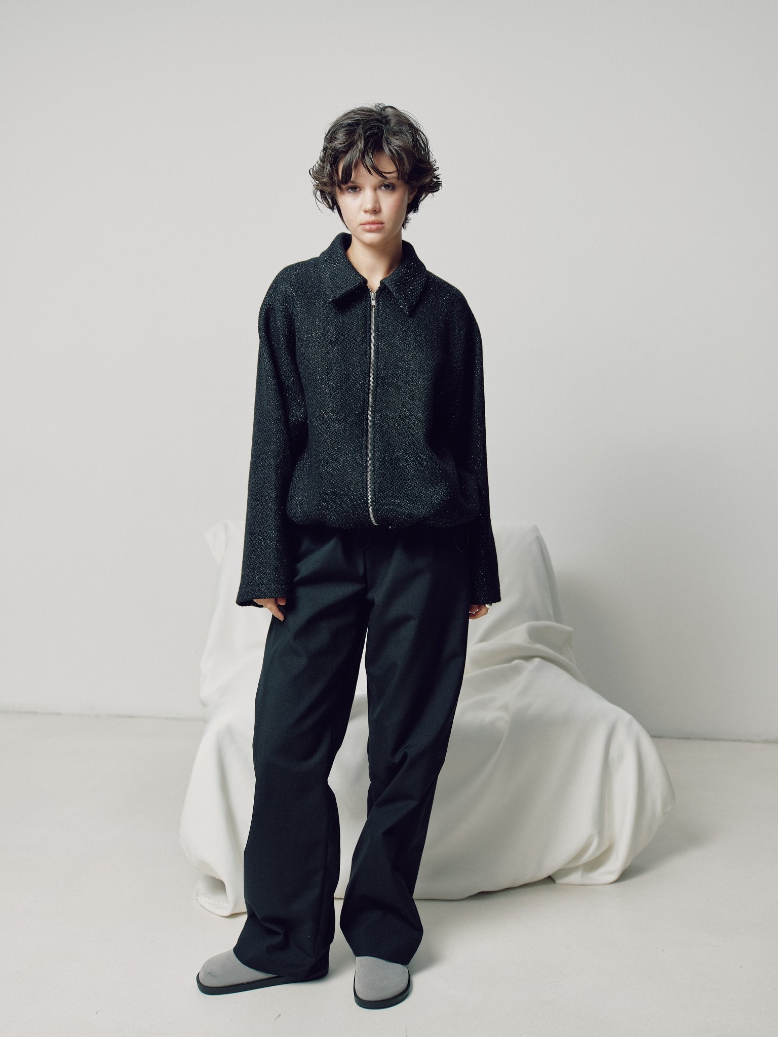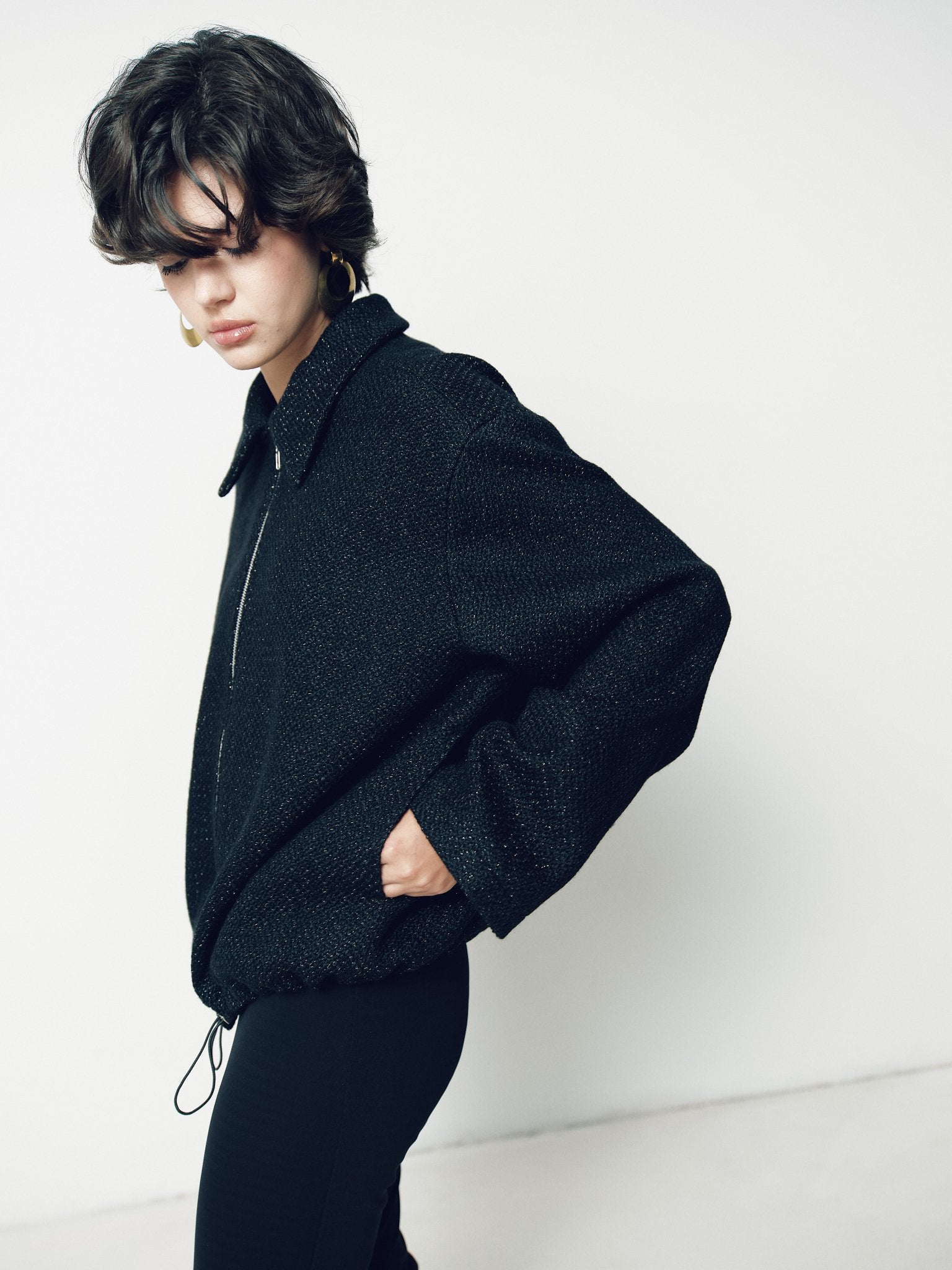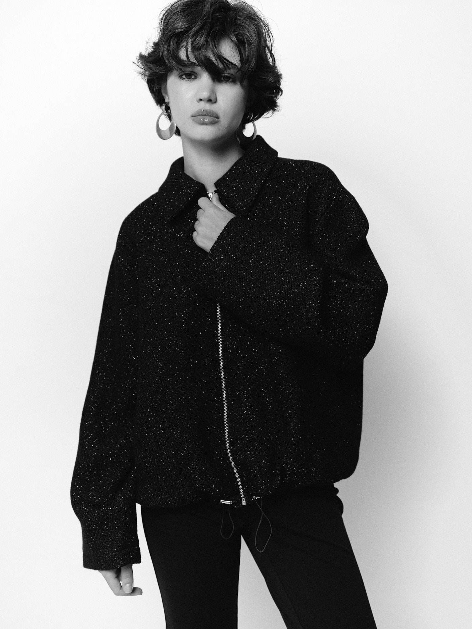 Оверсайз Бомбер чорного кольору з фактурної тканини що має люренксну нитку , з боковими кишенями на підкладці застібується на блискавку ykk