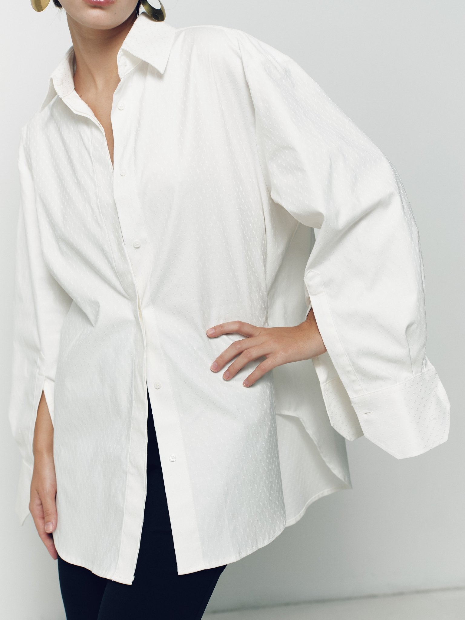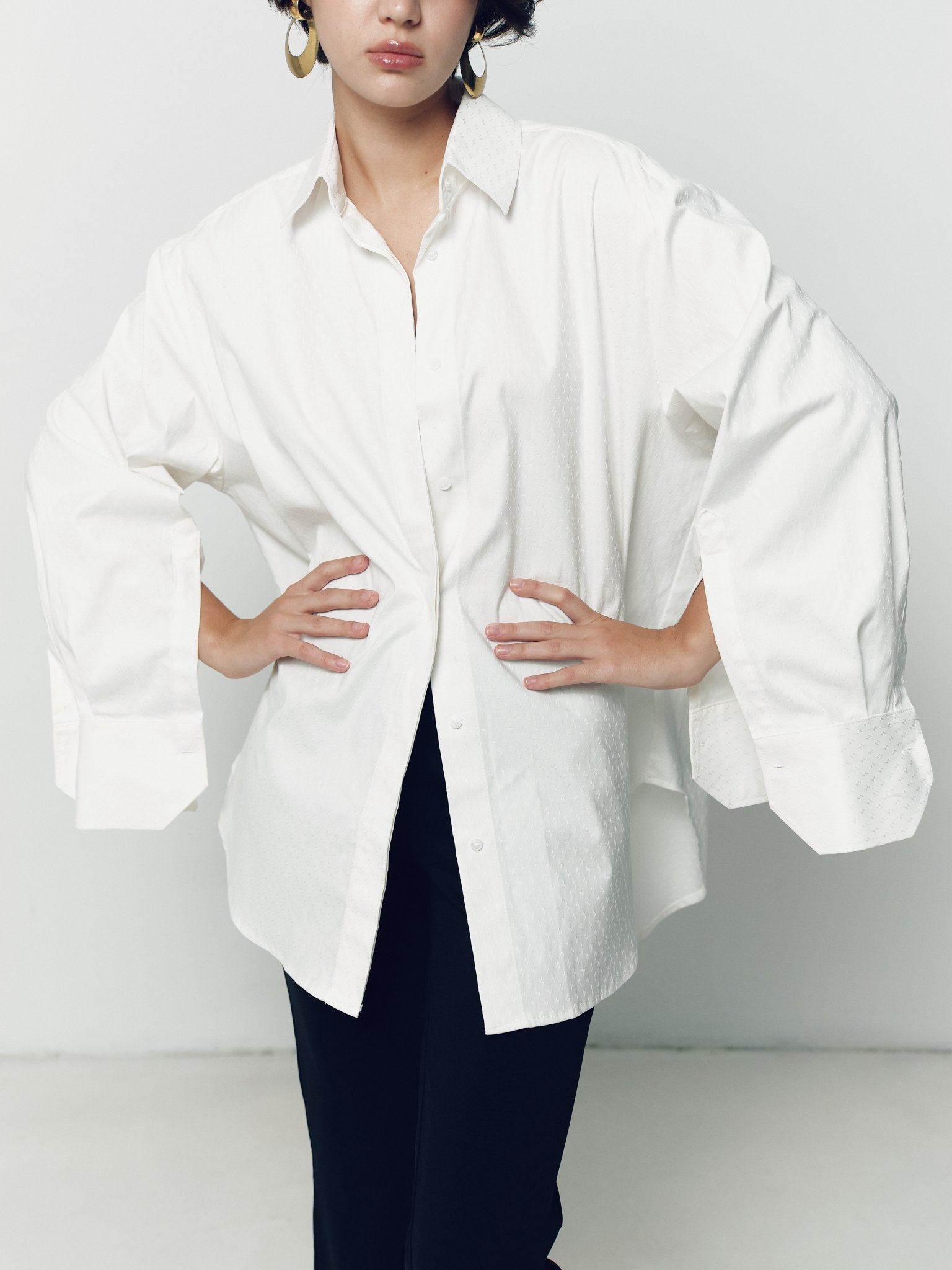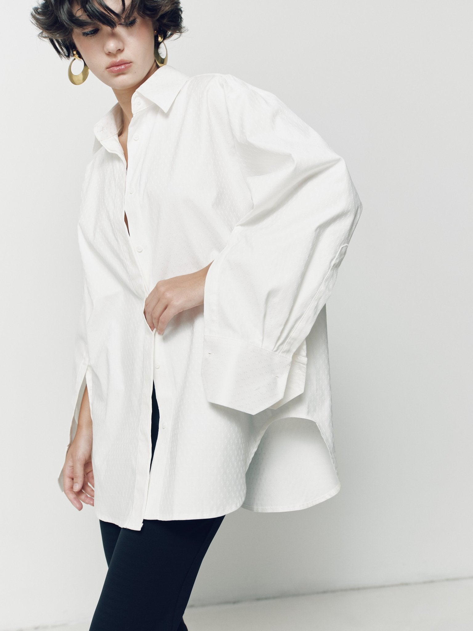 Класична біла біла  , вільного крою , без кишень з цікавим дизайнерськім рішенням - подвійни застібки на манжетах