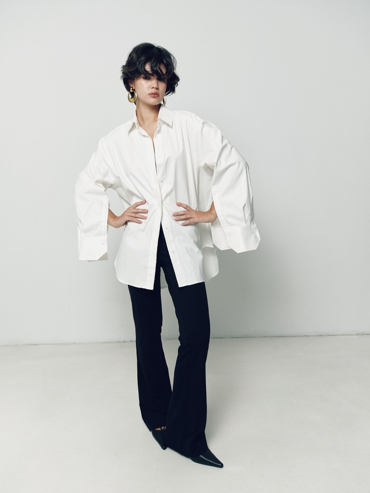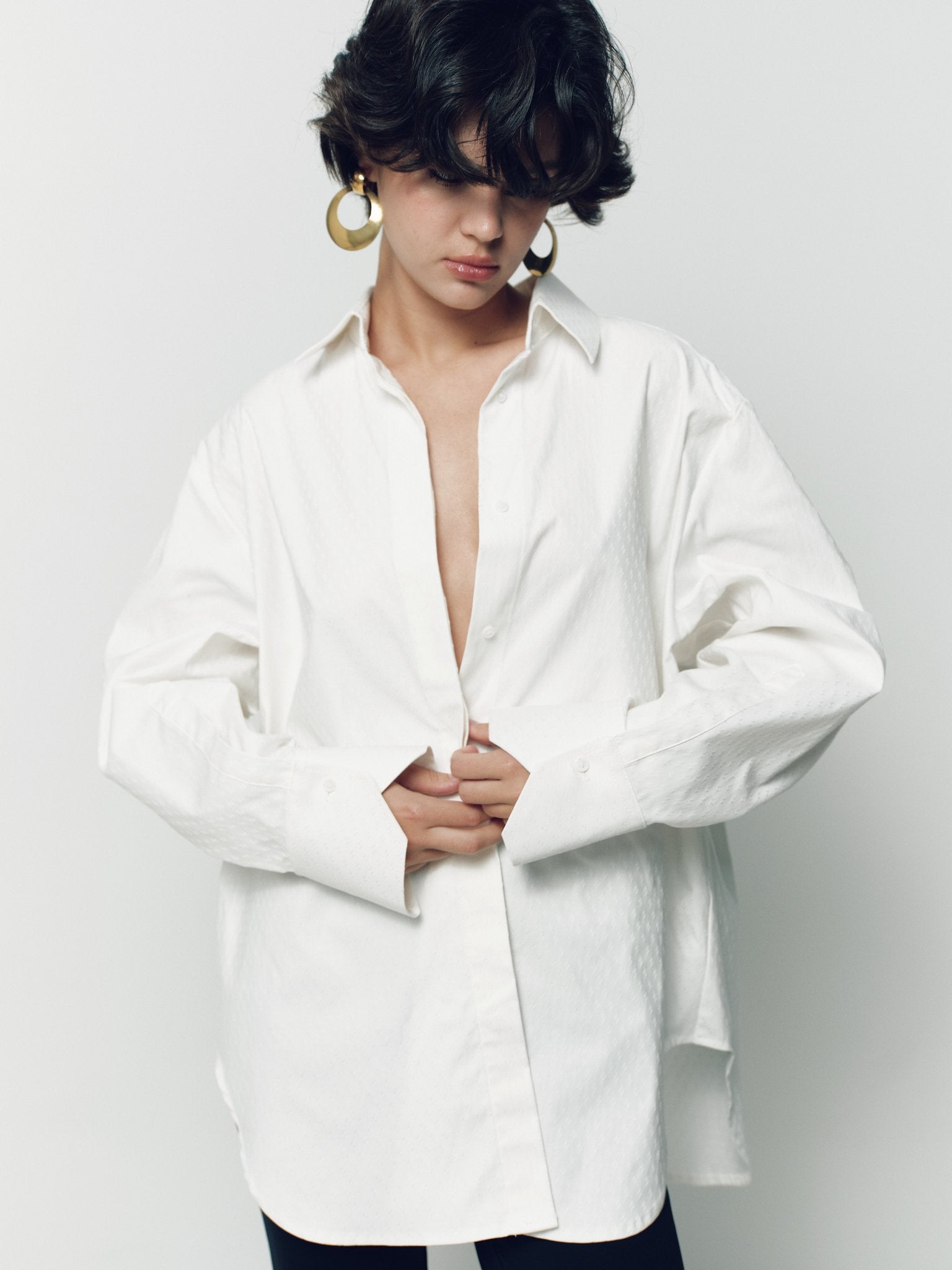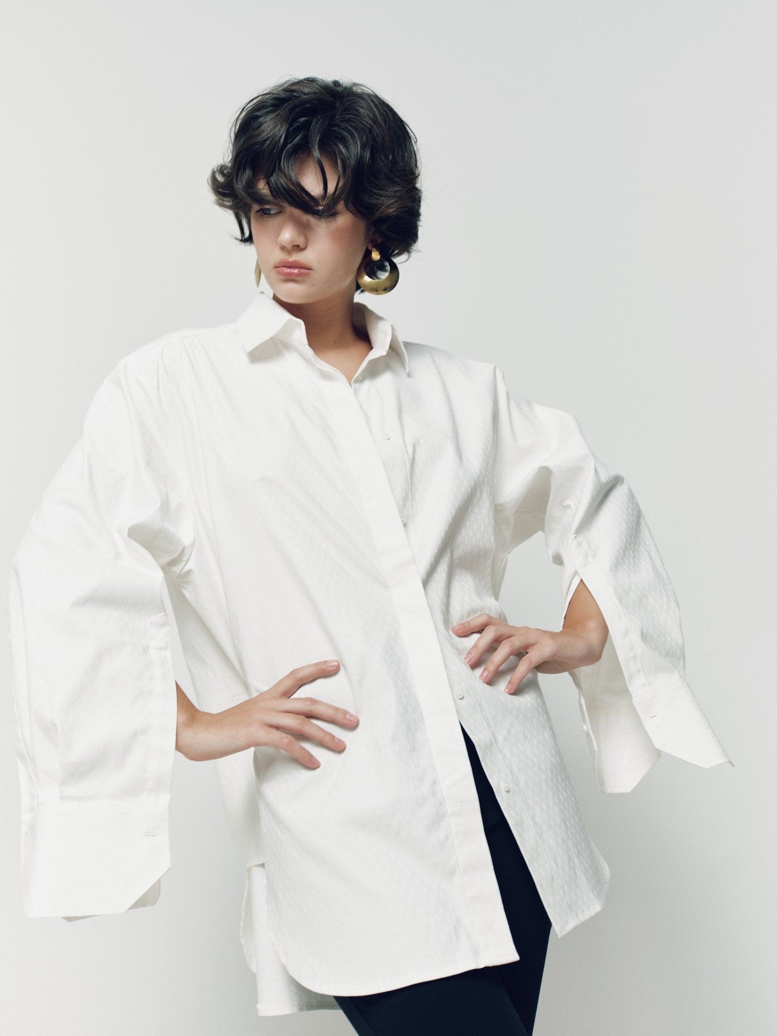 Класична біла біла  , вільного крою , без кишень з цікавим дизайнерськім рішенням - подвійни застібки на манжетах