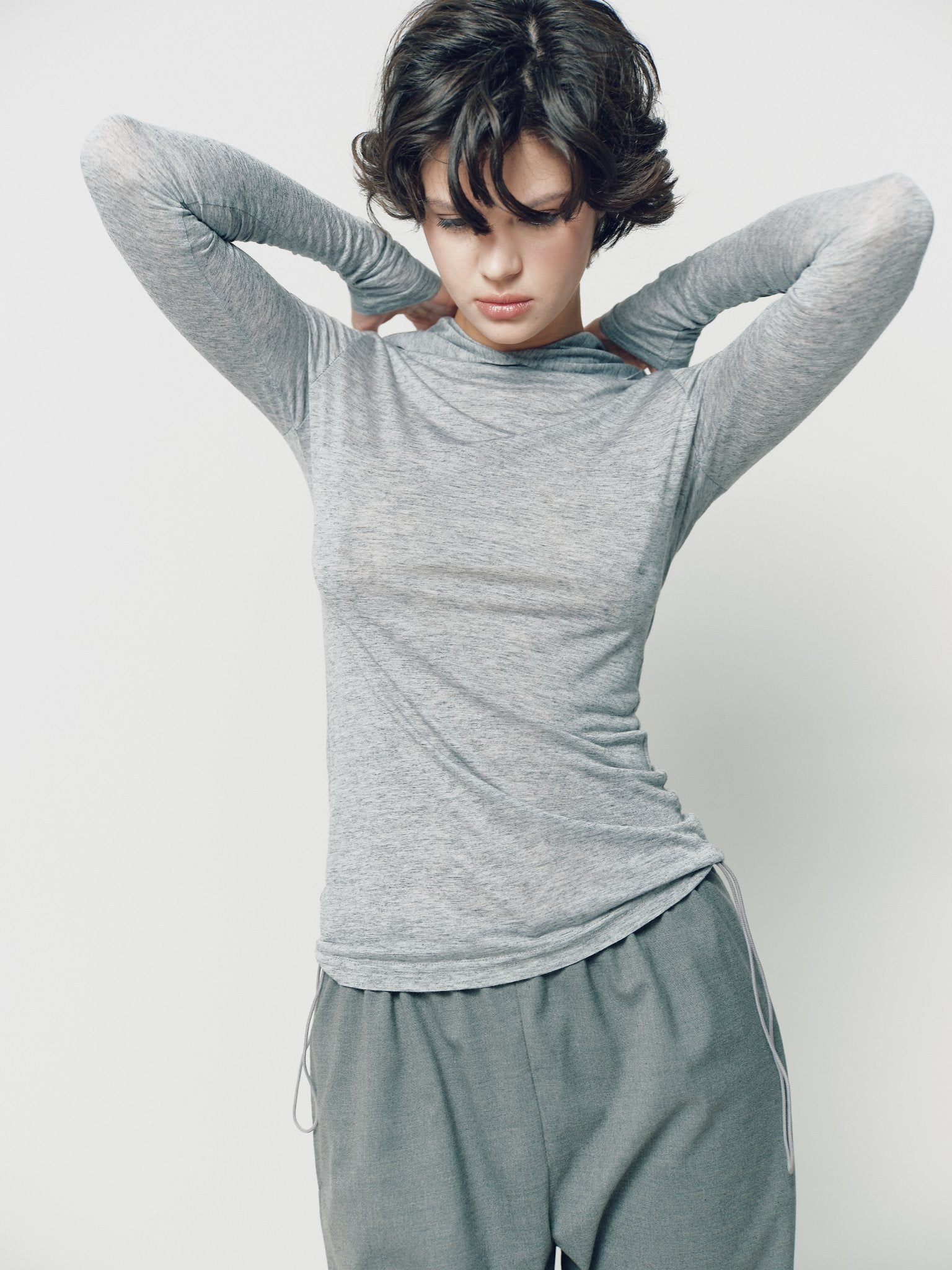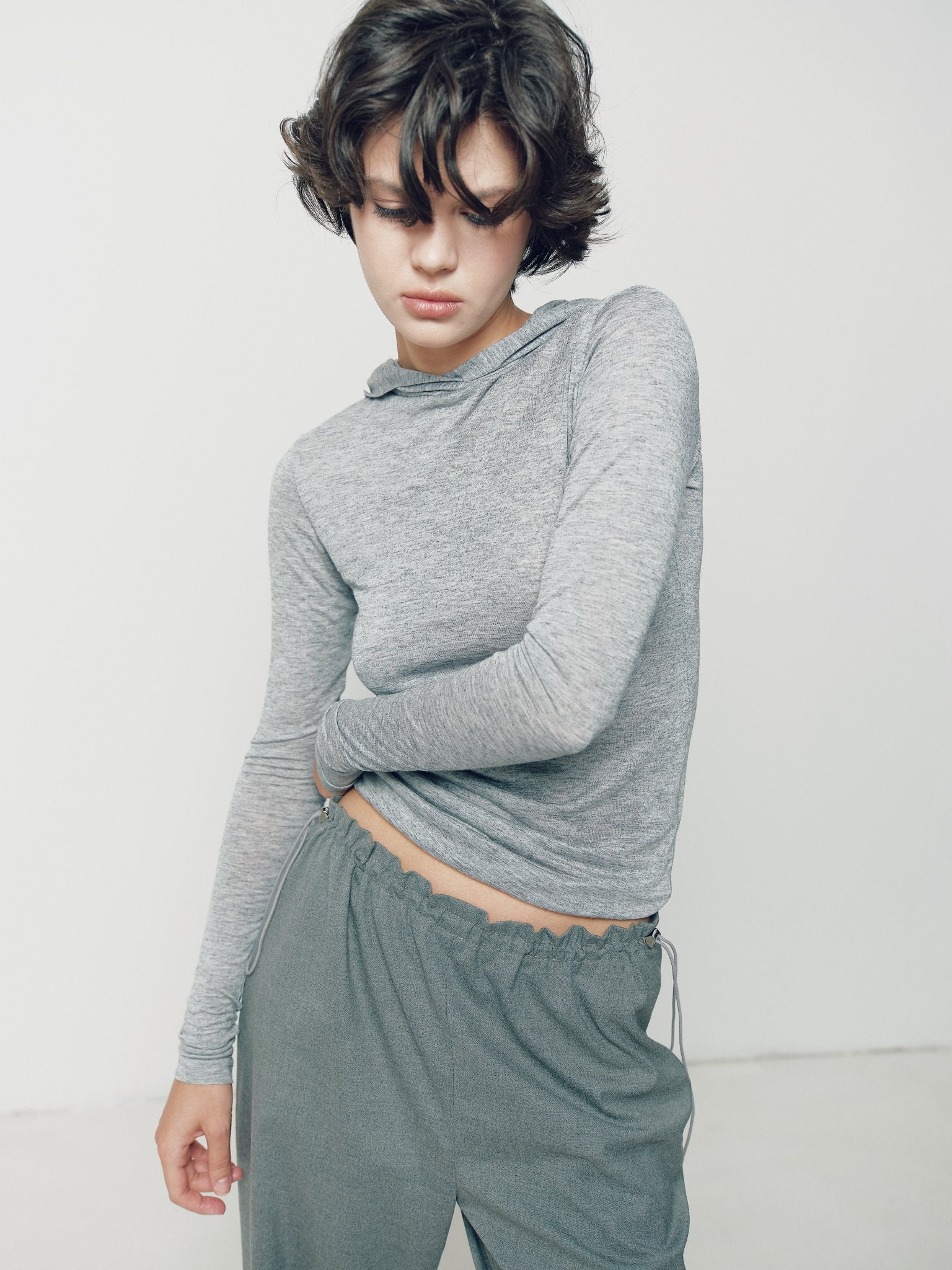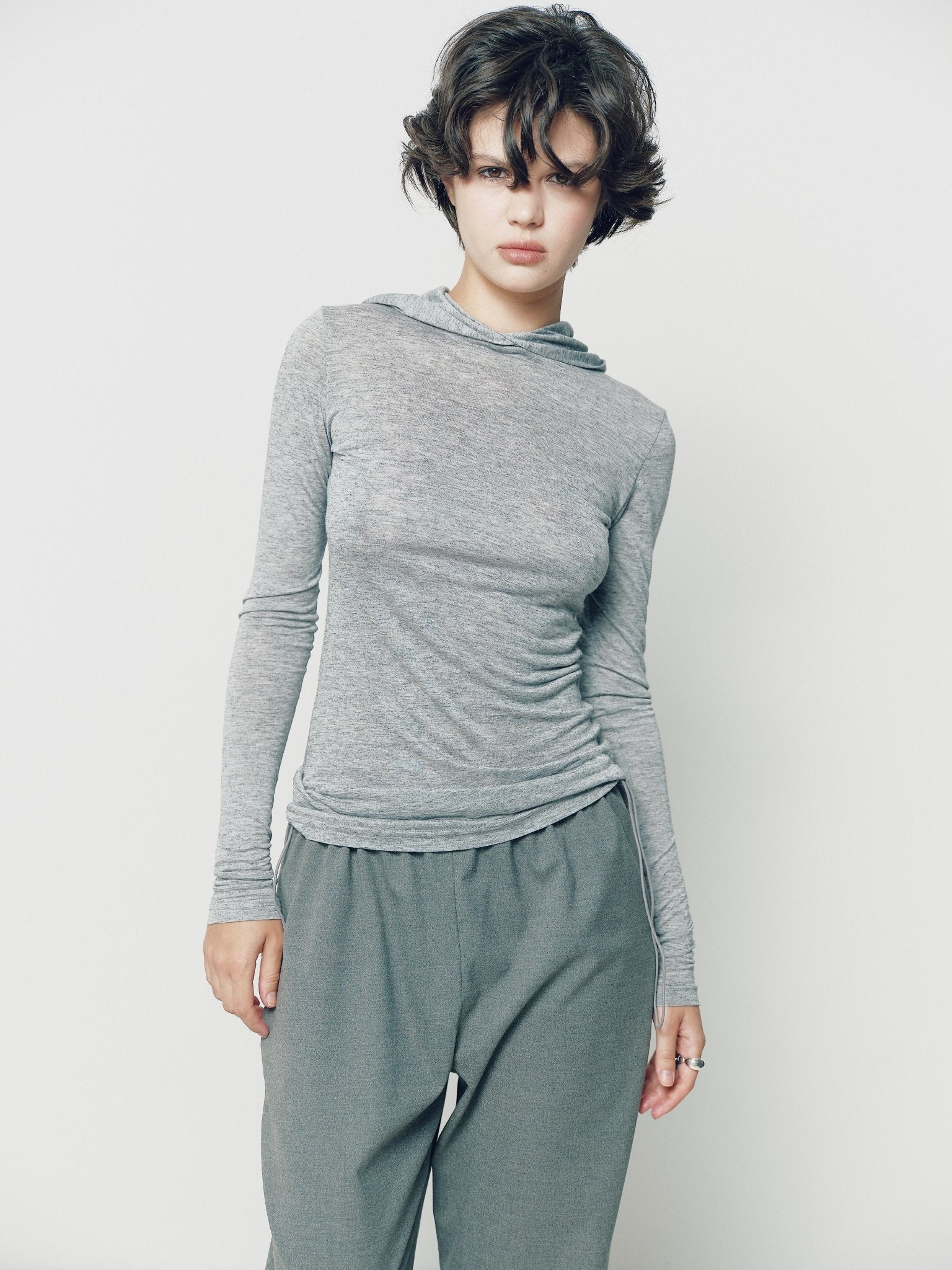 Сірий лонгслів з капюшоном з тоненької вовни приємний до тіла